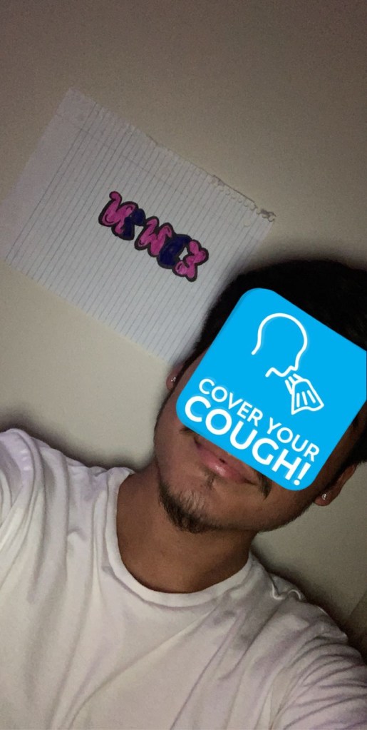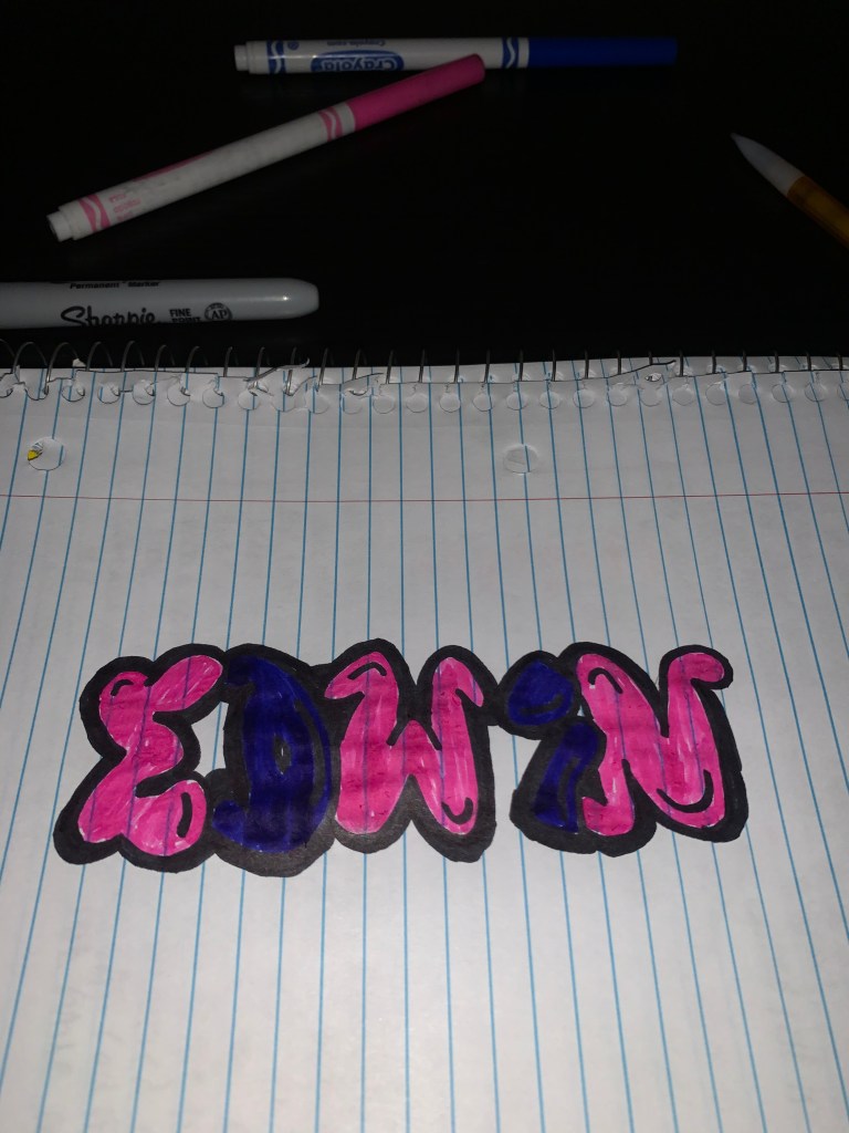 I was lucky enough to find two markers, and to my surprise, they were both my favorite colors: blue and pink. I started first with pink and the blue and did this pattern throughout my five letters. After completing it, I decided to just hang it up on the door of my room because I figured why not. Overall, my experiencing bubble letters was nice for both the actual process of doing the letters, something I found extremely fun, and because it allowed me to chill.