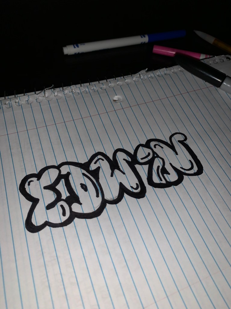 I free-handed everything since I thought you can’t really go wrong with “graffiti” style art since it can be your own thing. I first started off doing my name with a pencil since unfortunately, I did not have spray paint nor any paint at my parents house. I began to sketch the letters of my name. After, I got my black Sharpie and began to outline my name. I would add my own lines even after I had sketched out the outline for my name letters. I would add lines anywhere I felt like adding them. I would also “thicken” certain areas to make the letters more bubble like. After finishing outlining the letters in balck, I searched for markers.