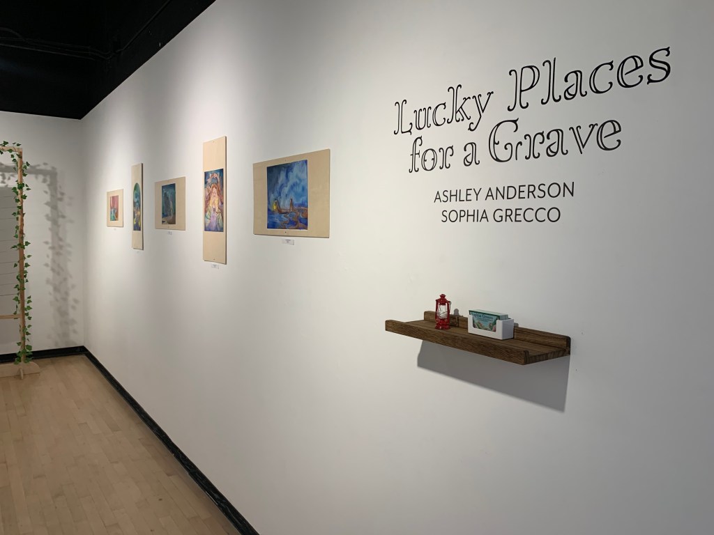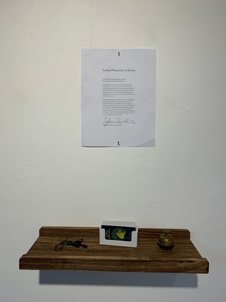 I highly enjoyed this exhibit because I was instantly drawn by how aesthetically pleasing this whole exhibit was. The color scheme used all throughout the pieces is extremely soothing even though every piece is different than each other. I also enjoyed how nice their painted backdrop included leaves all around it with a stand full of bottles to add to the “Folktale” vibe. The artist did a great job of exploring her ideas and enabling the viewer to get a message out of every piece.